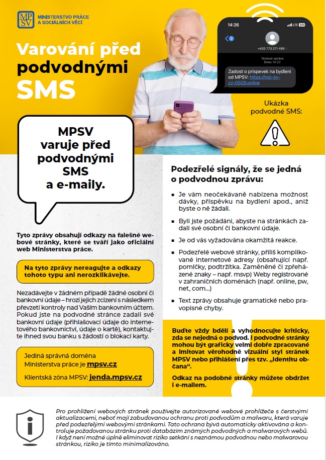 Ministerstvo práce a sociálních věcí varuje před podvodnými SMS a e-maily.