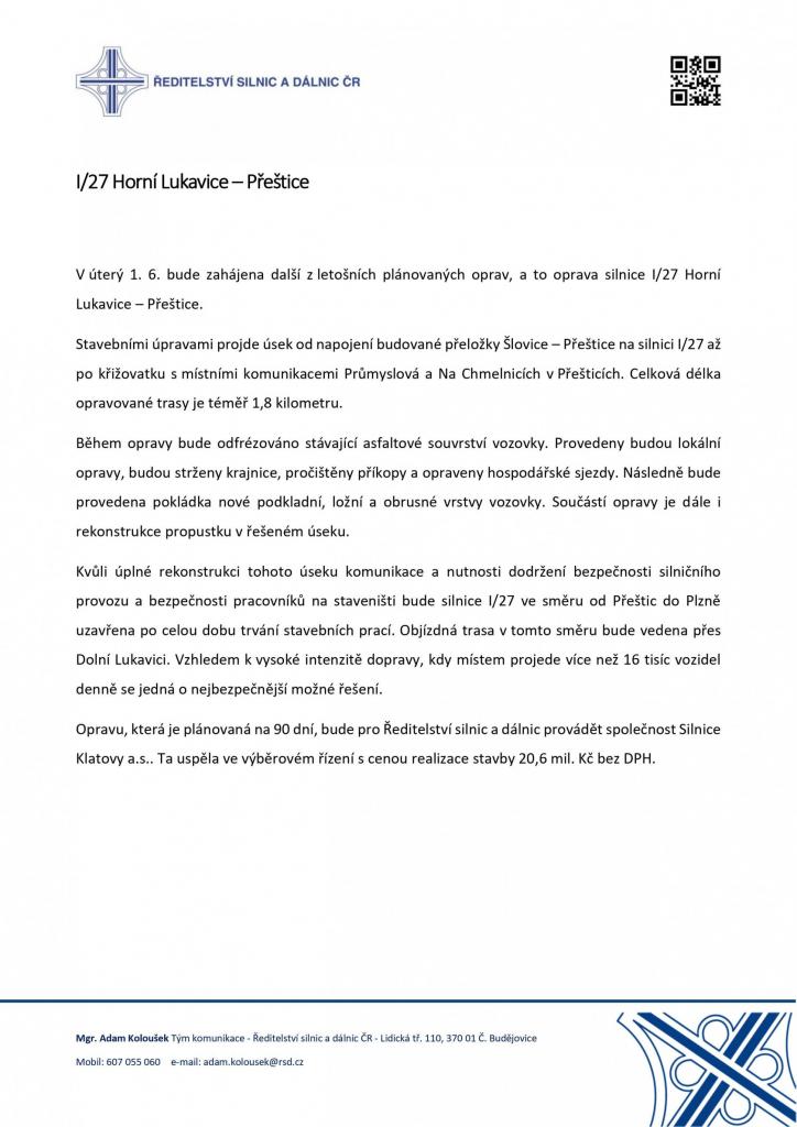 Od úterý 1. 6. bude probíhat oprava komunikace I/27 v úseku Horní Lukavice - Přeštice. Tento úsek bude zcela uzavřen ve směru od Přeštic do Plzně, objížďka bude vedena přes Dolní Lukavici.