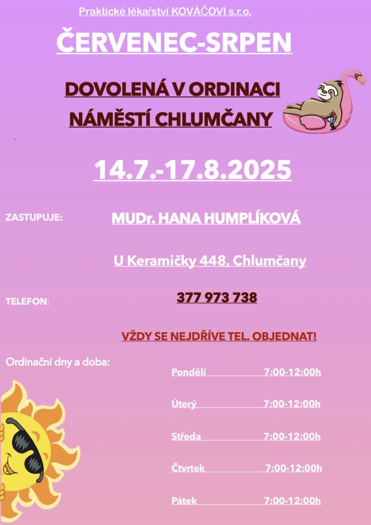 Praktické lékařství Kováčovi s.r.o. - červenec-srpen 2025 - dovolená - ordinace Náměstí B. Kašpara, Chlumčany.