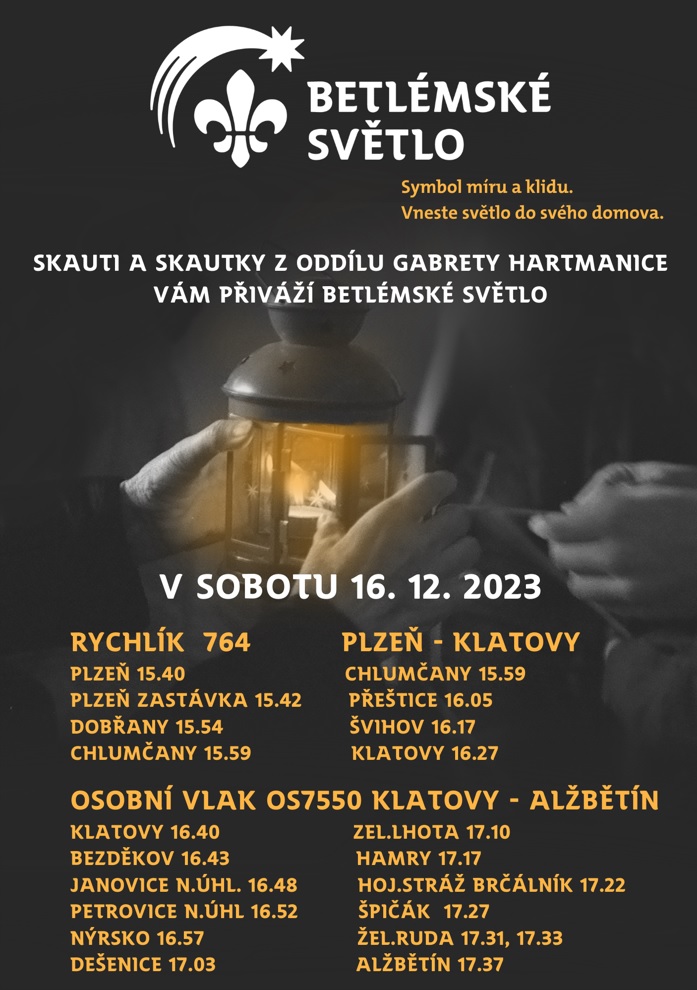 Skauti a skautky z oddílu Gabrety Hartmanice Vám přivezou betlémské světlo.