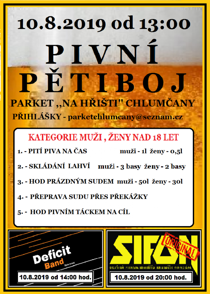 V sobotu 10.8.2019 od 13:00 se koná Pivní pětiboj na parketu "Na hřišti" v Chlumčanech. Od 14:00 zahraje Deficit band a od 20:00 hraje Sifon.